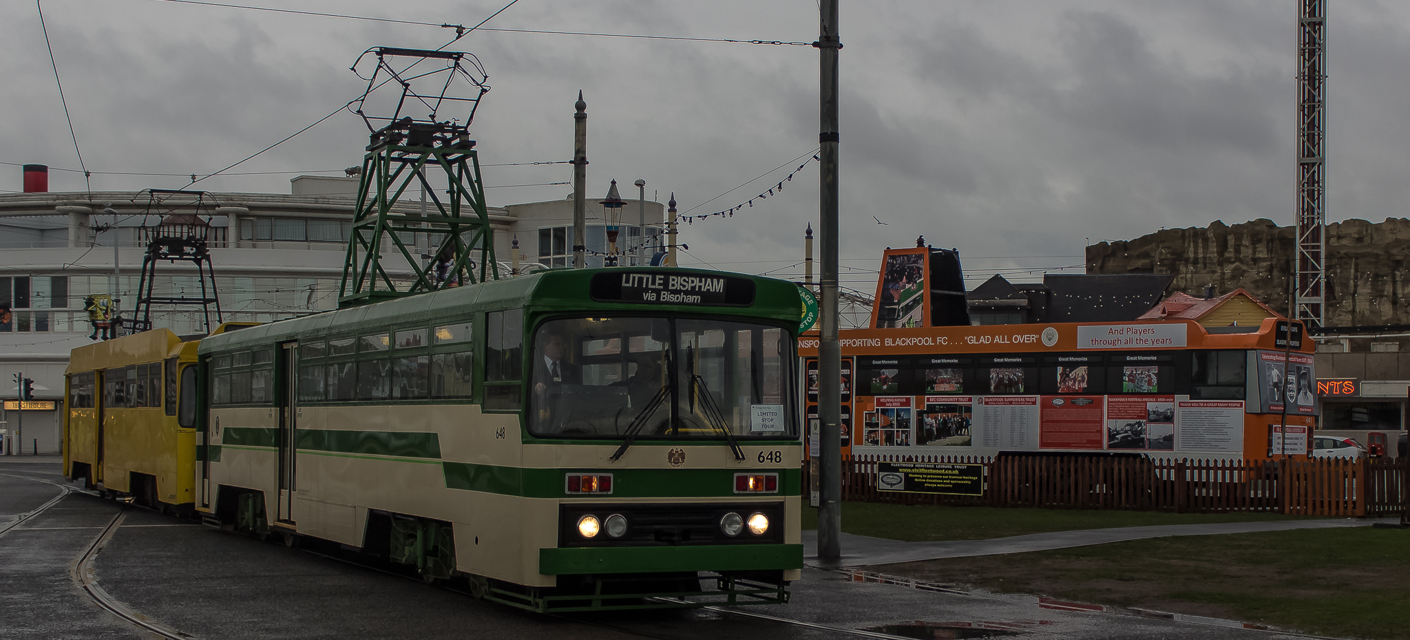 Dismal weather cannot stop the Centenary car fun as 648 leads 642 on the Pleasure Beach loop whilst 641 looks on in the background from its temporary display position.