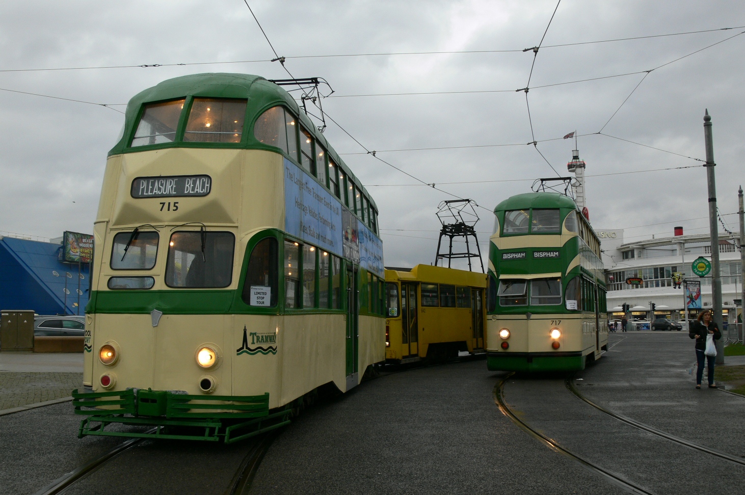 Two of the most heavily used heritage trams at Blackpool in 2015, Balloon cars 715 and 717, meet at Pleasure Beach on the last day of the season with Centenary car 642. (Photo by Andrew Waddington)
