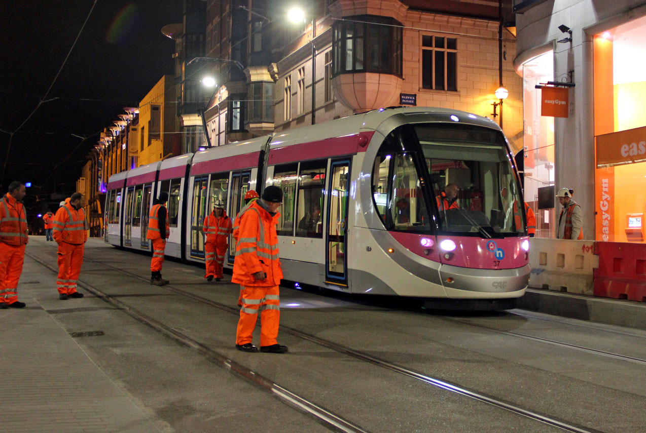 37 makes its first run down Corporation Street under the watchful eye of engineers.