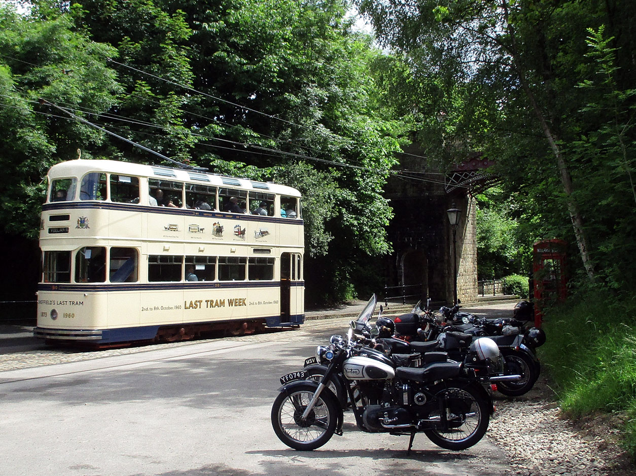Some veteran motorbikes on display as Sheffield 510 passes in the background.