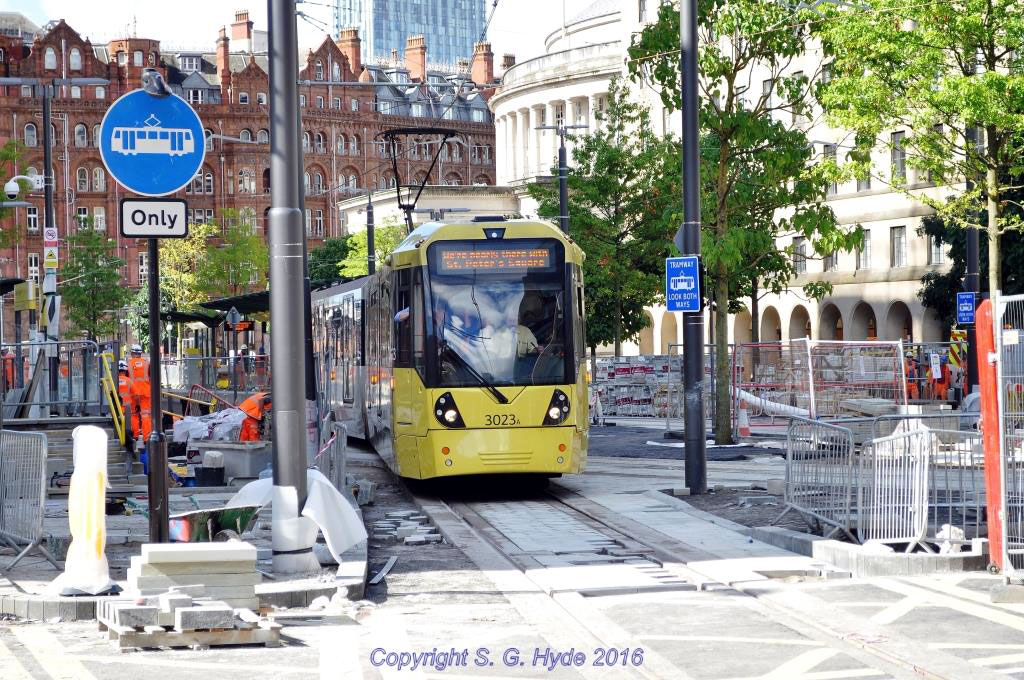 On 26th August during testing 3023 is seen running as a single unit from Trafford Depot on its way to the Sheffield Street siding behind Piccadilly Station. Note the special destination display ‘We’re nearly there with St Peters Square’.