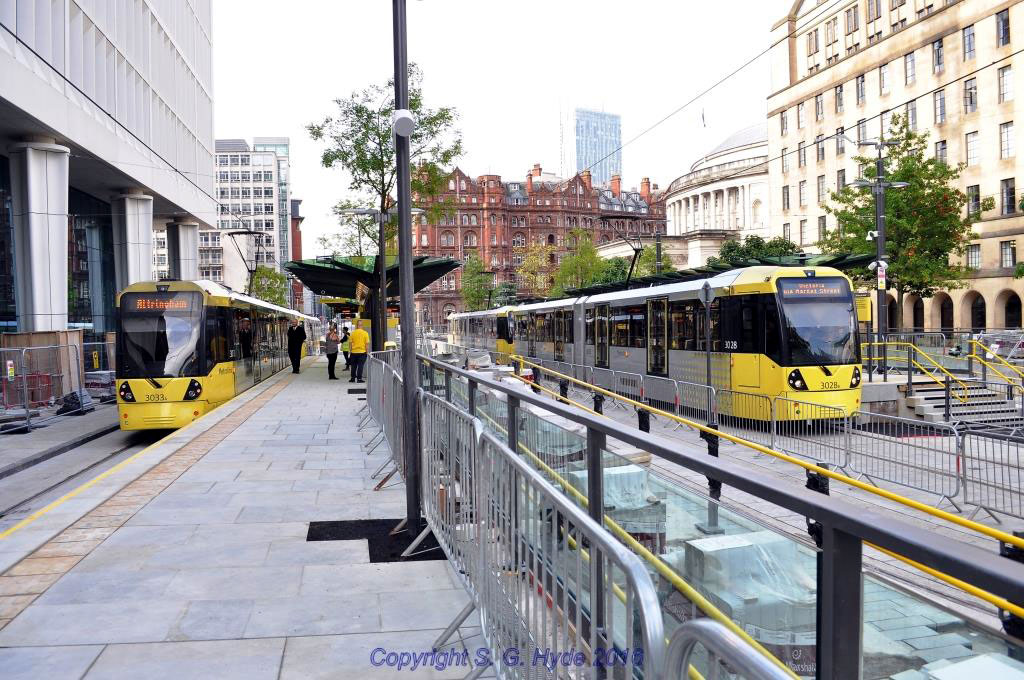 The current set-up at St Peter’s Square is seen here with 3033 at the rear of a double unit bound for Altrincham leaving the 1CC southbound platform whilst another double unit with 3028 leading waits to leave northbound for Victoria. (All Photographs by Steve Hyde)