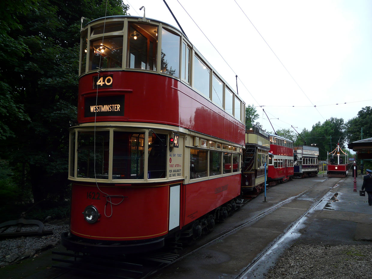 The end of the day at Wakebridge and the four London trams running the last service are met by Blackpool 166 heading back to depot. (Photograph courtesy of Crich Tramway Village)