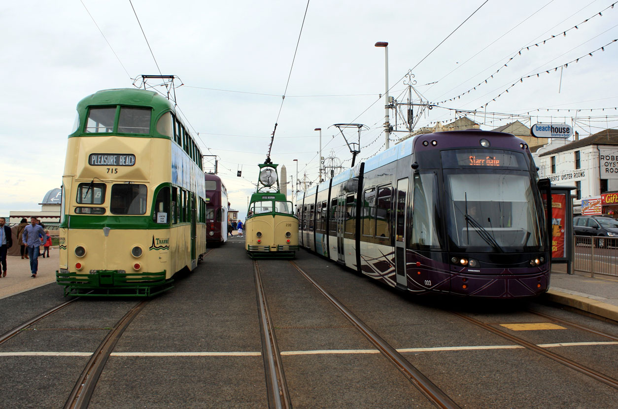 A busy scene at North Pier with Boat 230 running through the centre line for Little Bispham with shop tram Balloon 719 and Balloon 715 on the siding. Flexity 003 completes the scene at the southbound platform.
