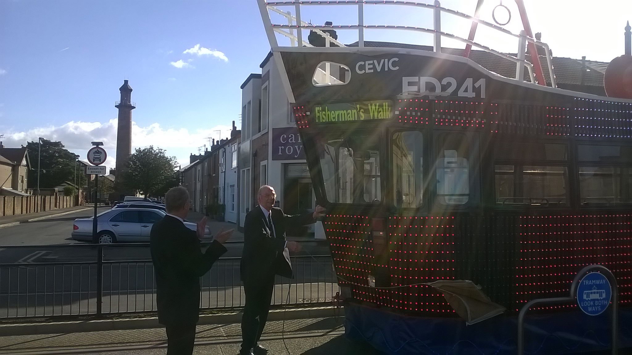 On arrival at Fleetwood, the tram was officially launched by Tony Lofthouse who revealed the name ‘Cevic’ on the front of the tram – in very bright sunlight!