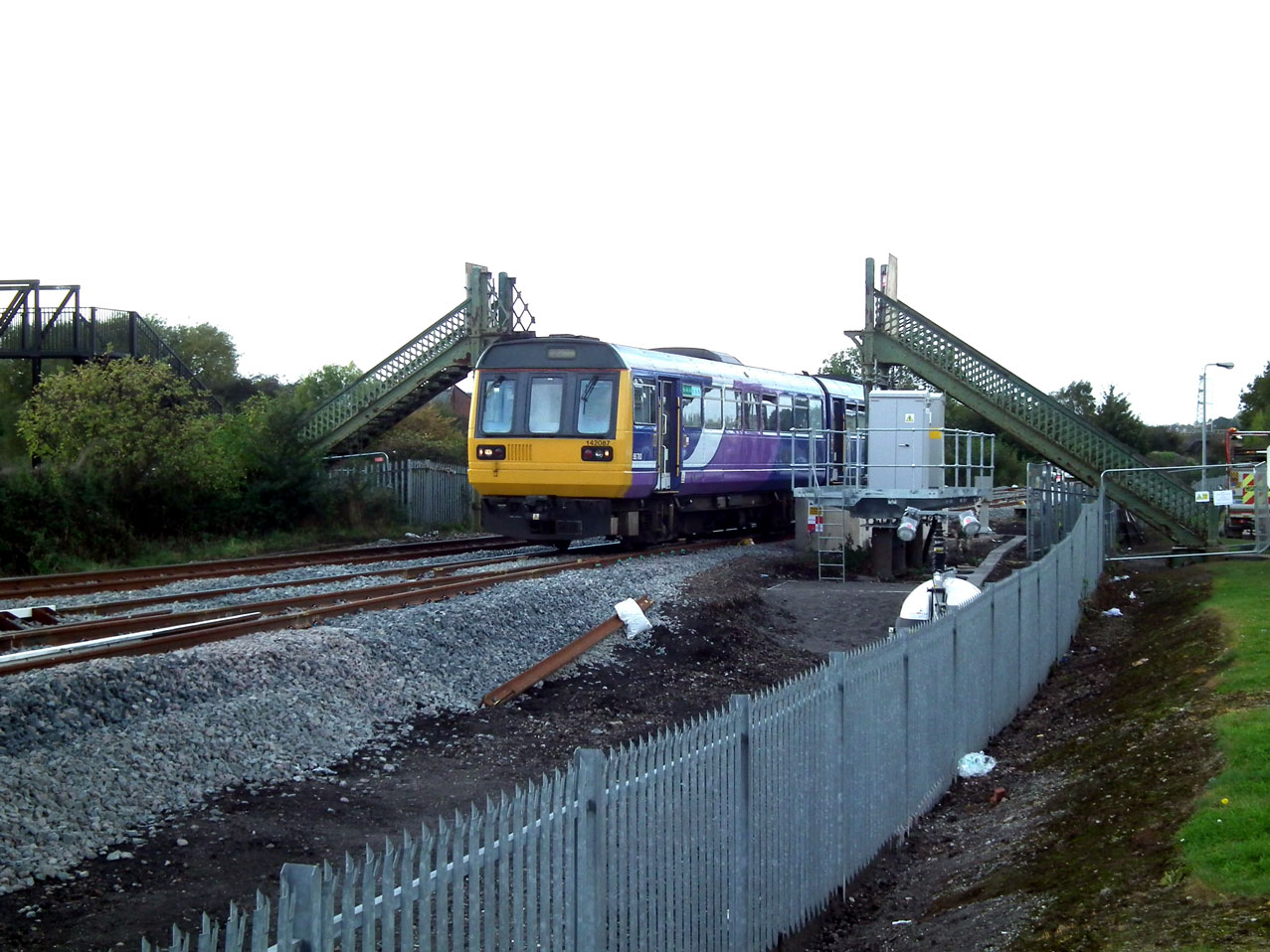 Arriva Northern dmu 142087 running as the 11.24 Sheffield to Scunthorpe service passes over the newly installed tram-train junction at Parkgate on Monday 17th October 2016. Notice also the equipment cabins placed on a raised platform as an anti flood damage precaution and that the long established footbridge has had its deck removed. (All Photographs by Mike Haddon)