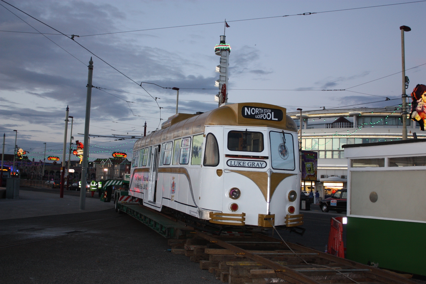 With the illuminations shining brightly behind, 290 is seen being gently coaxed down the ramp from the Scott’s lorry onto the new display siding located opposite the Pleasure Beach. (Photo by Andrew Blood)