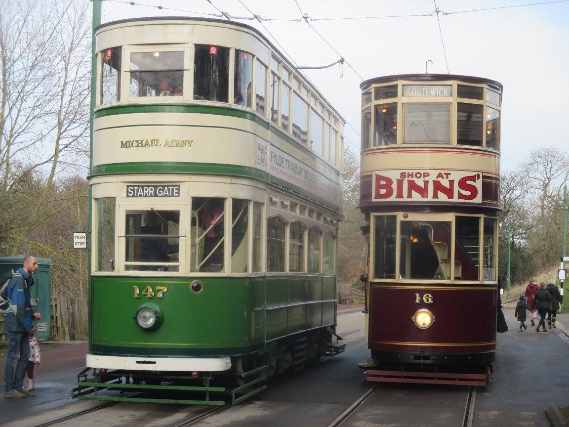 Another delightful double-deck pair. This time 147 is joined by Sunderland 16 at the entrance tram stop at the end of the day.