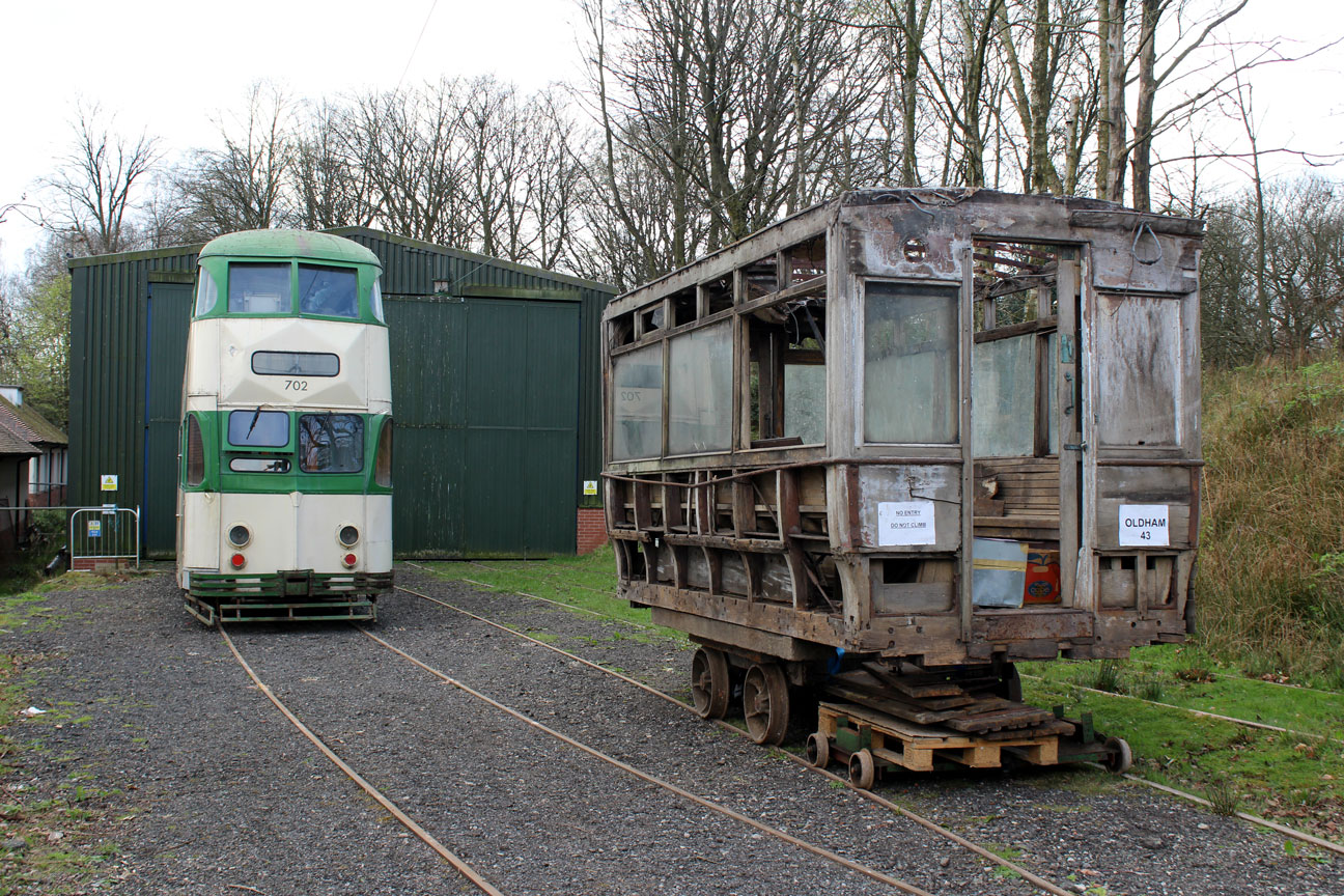 Two of the stored trams on display were Blackpool 702 and Oldham 43. The pair are seen here outside Lakeside Depot. (Photograph by Gareth Prior)