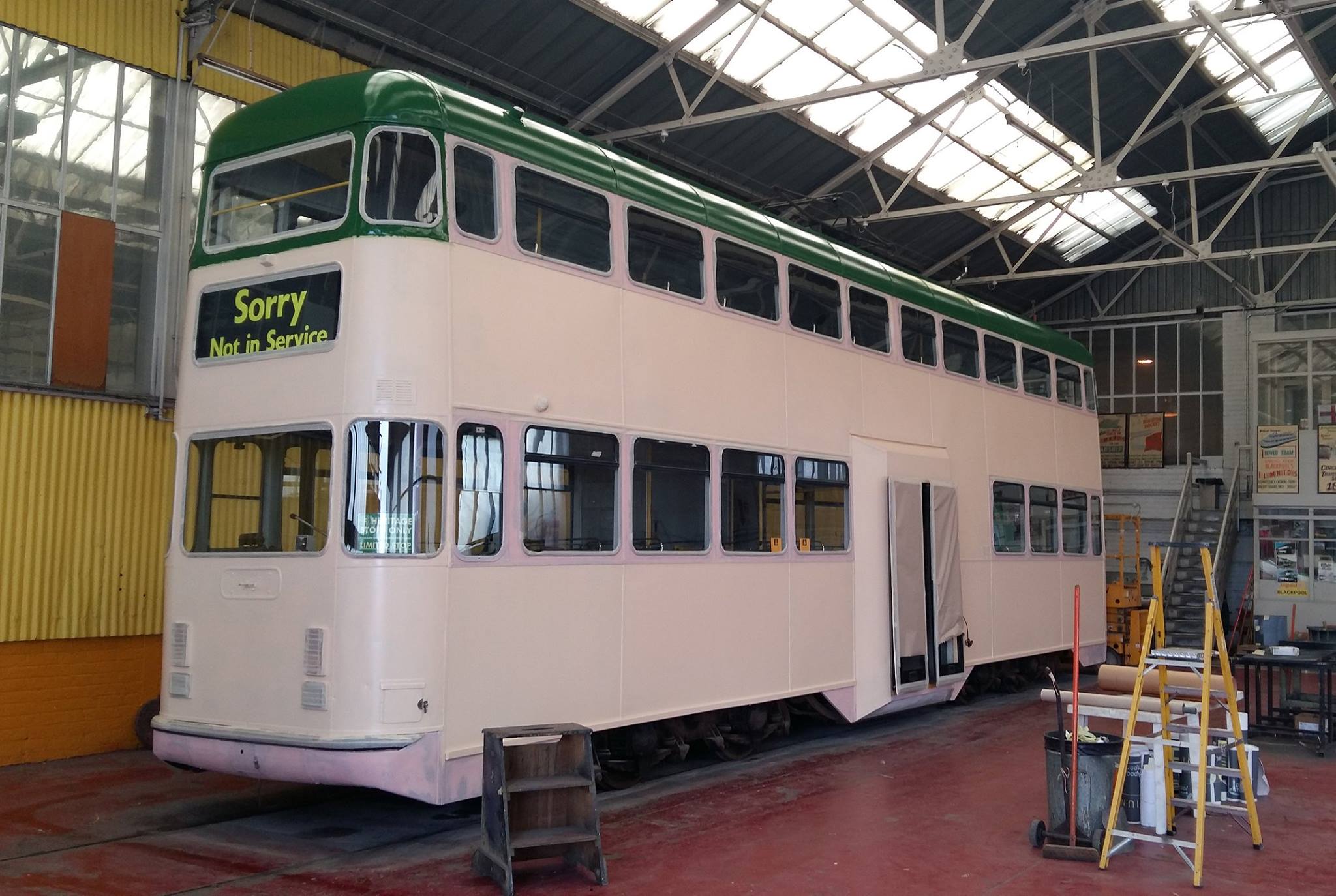 718 is seen in the Paint Shop in the early stages of receiving green and cream for the first time since it was transformed into a Millennium car. (Photo courtesy of Blackpool Heritage Tram Tours)