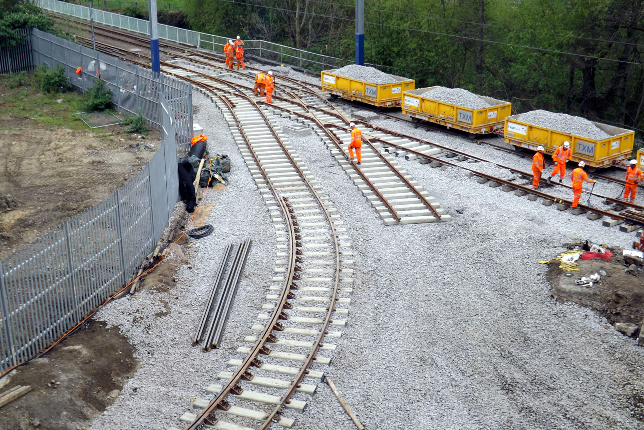 The junction is installed at Tinsley. The ballast train is on the Supertram line with the inbound line already joined up with the start of the outbound line also in place. (Photograph by Martin Hague)