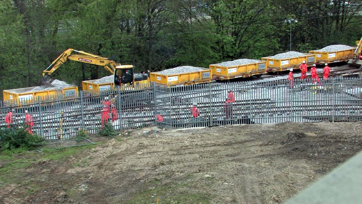 Work on the junction continues in this view from a different angle with the ballast train on the Supertram line. (Photographs x2 by Glyn Hill)