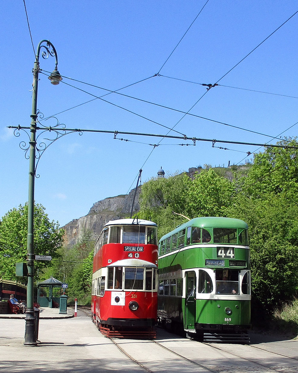 Two modern double deckers pass at Victoria Park with Liverpool’s 869 heading down the town as Metropolitan Electric Tramways 331 is off north.