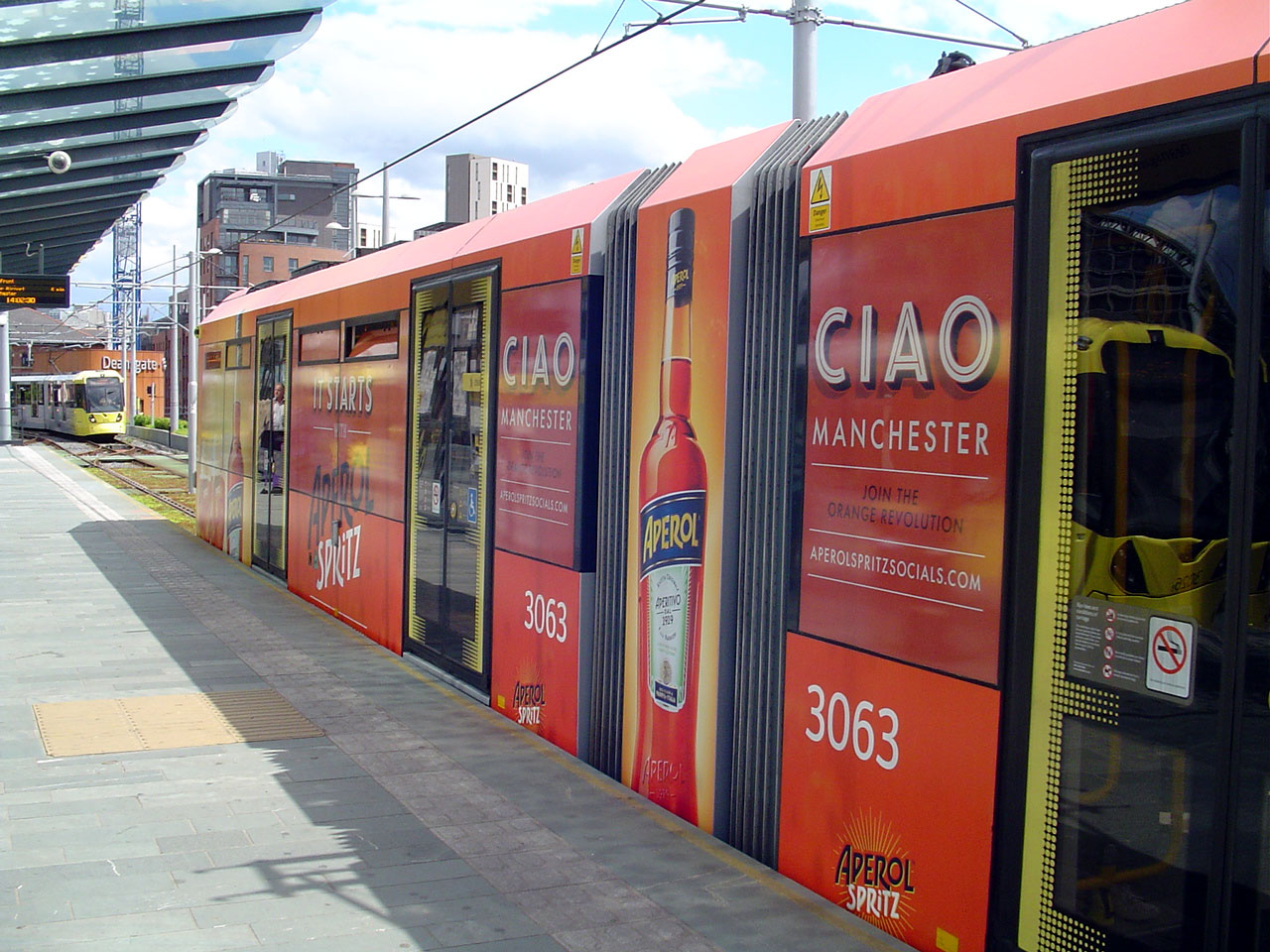 A close-up of the advertising vinyls on 3063 with two other trams also visible in the shot. (Both Photographs by Dave Elison)