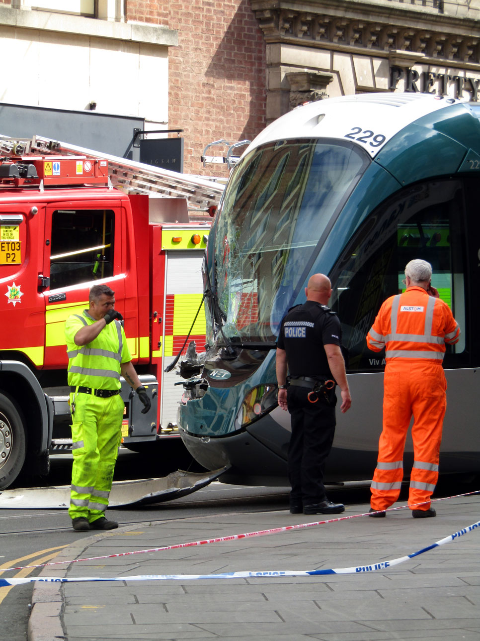 The lorry has now been moved and the damage to the front of 229 can once again be seen in more detail.