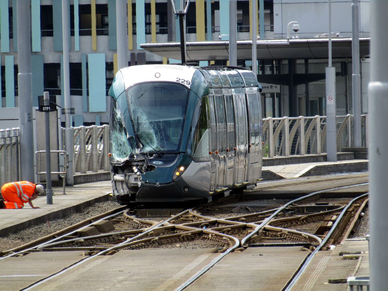 229 was driven wrong line onto Broadmarsh Viaduct from the undamaged end and was shunted onto the outbound track. This view shows the tram with the damaged end closest to the camera. After this photo was taken the tram was driven back to depot from the damaged end. (All Photographs by David Beardsell)