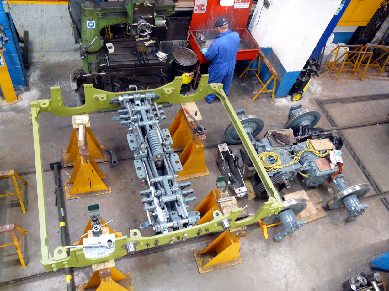 The south bogie is seen from the Workshop viewing gallery as it is dry assembled. The wheels and motors are seen alongside.