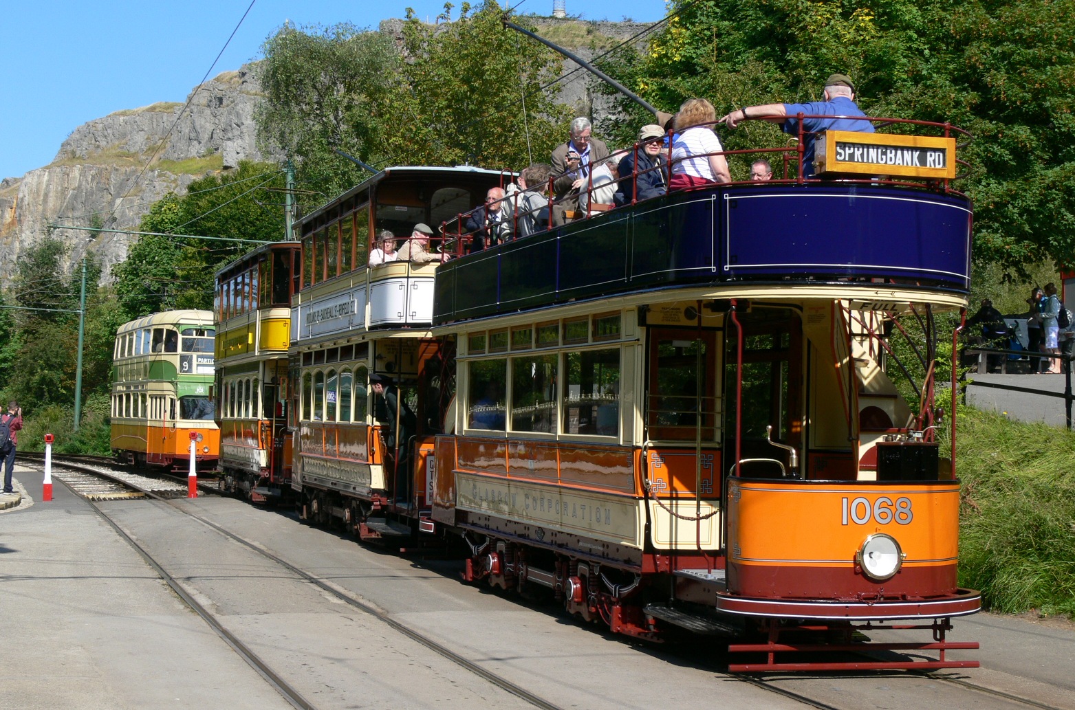 An excellent line-up of Glasgow trams, led by the immaculate 1068, seen at the car park stop on their way back from Glory Mine. (Photo by Tony Waddington)