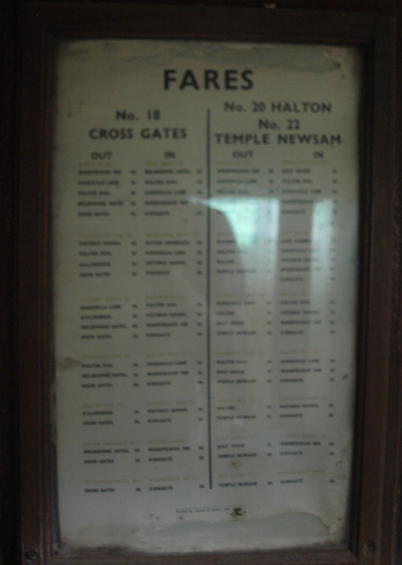 Even though the tram is in poor condition the fare table for the Cross Gates and Temple Newsam route is still in good condition if very hard to photograph. (Photo: Jamie Guest)