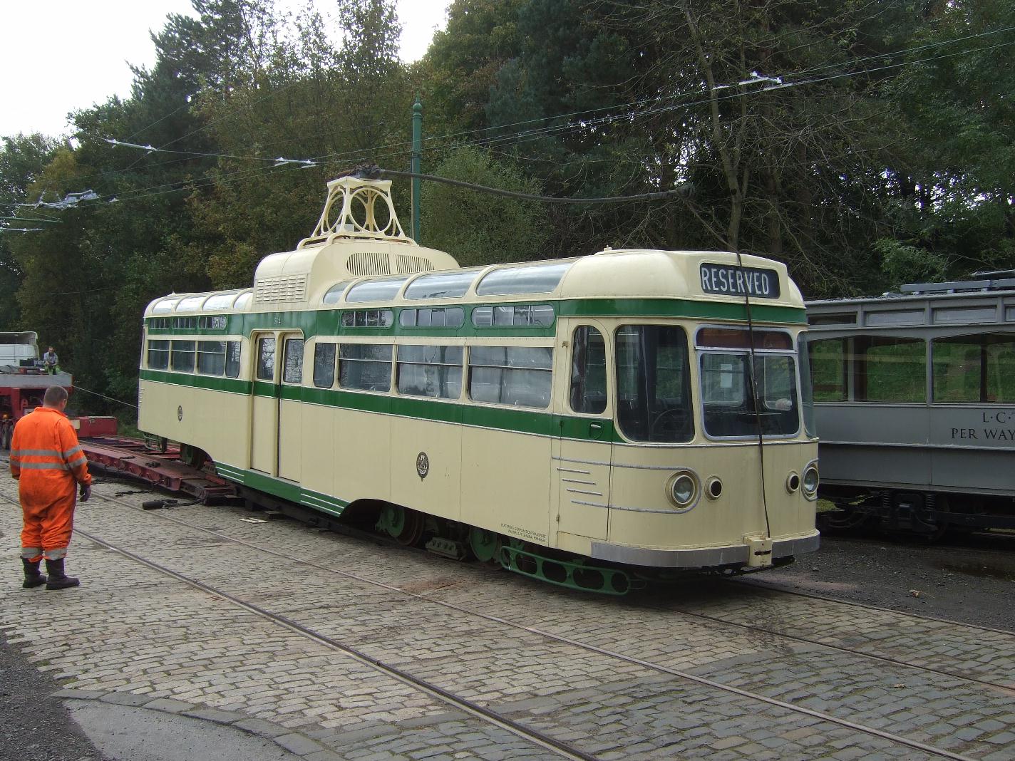 The delicate operation of unloading a tram as large as 304 can be seen in this view as the Coronation touches down on Beamish tracks on 12th October, with Leeds 6 looking on.