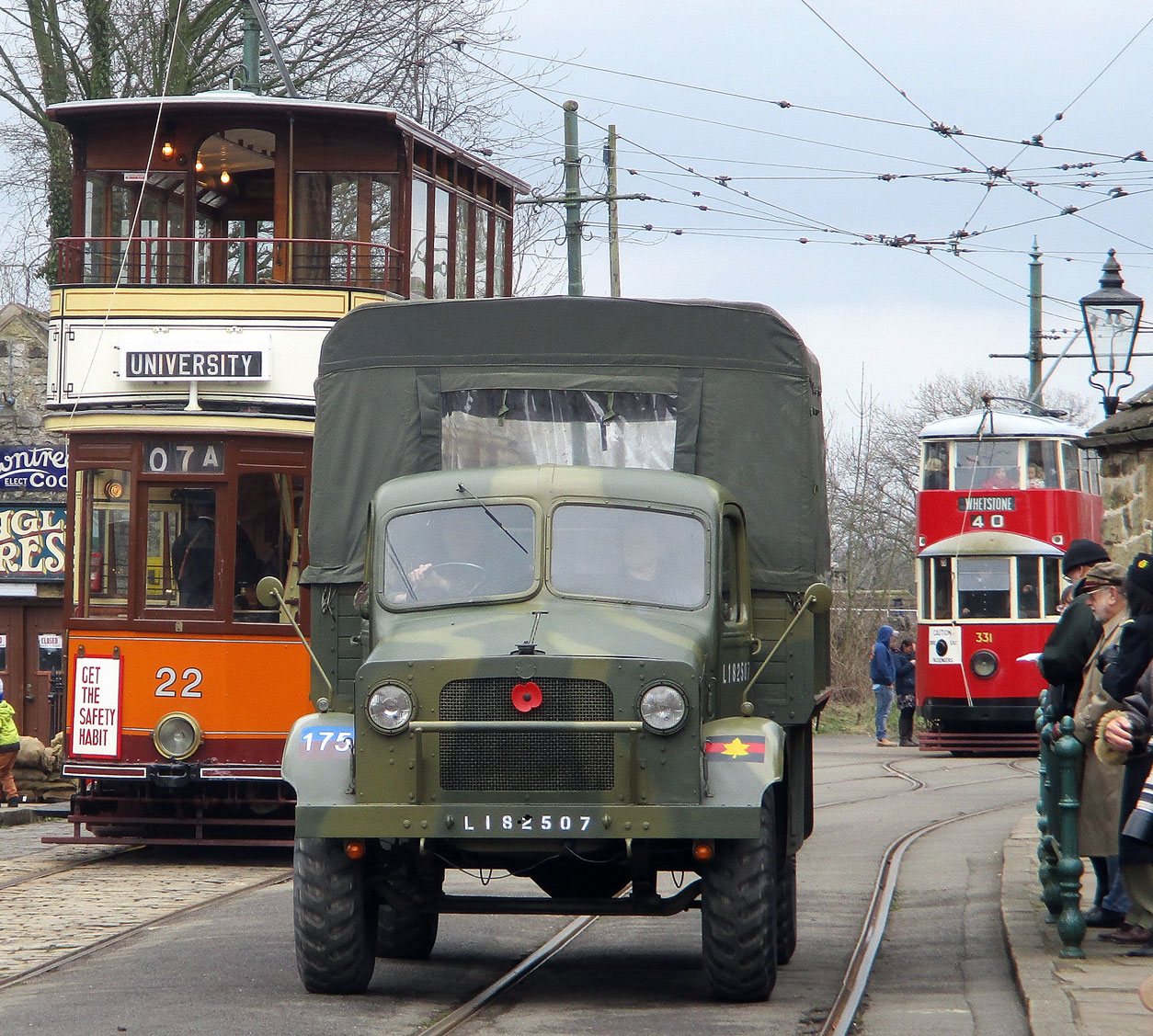 As a military vehicle approaches the camera Glasgow 22 waits at Stephenson Place with MET 331 down at the Town End stop.