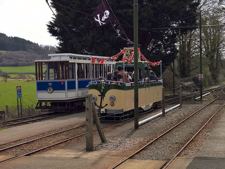 The Seaton Pearl decorated for its use on the pirate specials heads back to Seaton through Colyford with 15 having shunted out of the way into the siding. (All Photographs by Mike Poole)