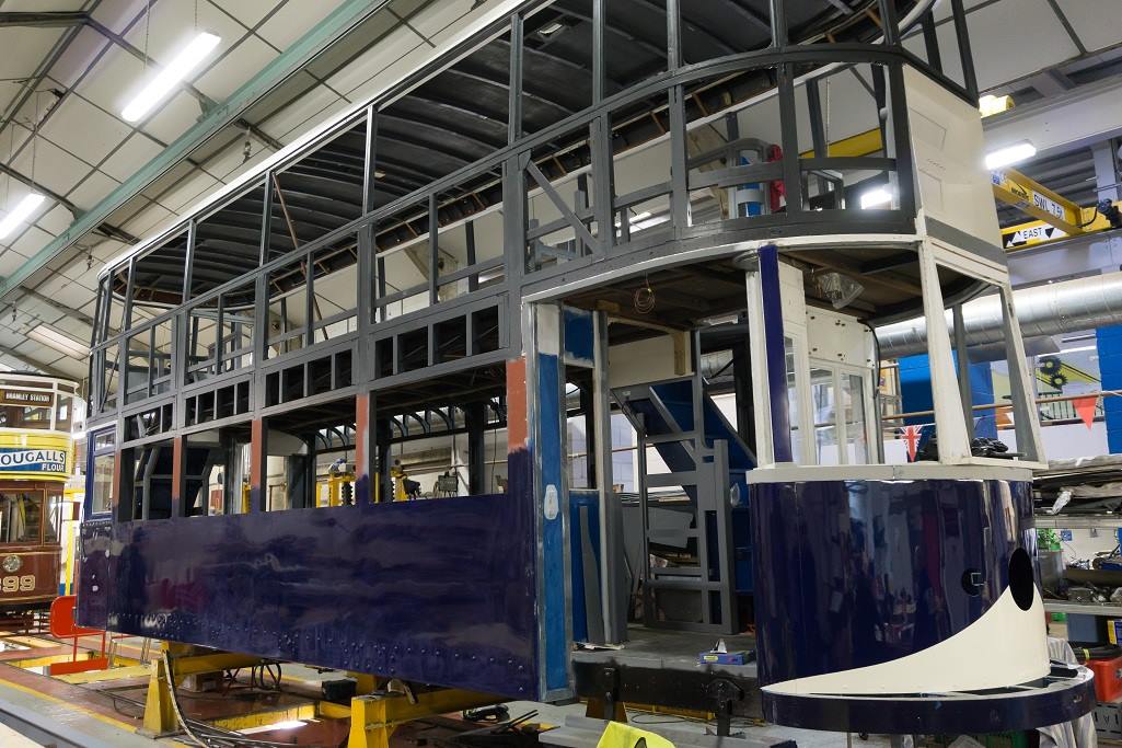 Inside the workshop we get a better look at LCC 1 and the paintwork on its lower deck end and sides, with the stunning blue livery and white end ‘V’ in evidence. What a beauty!