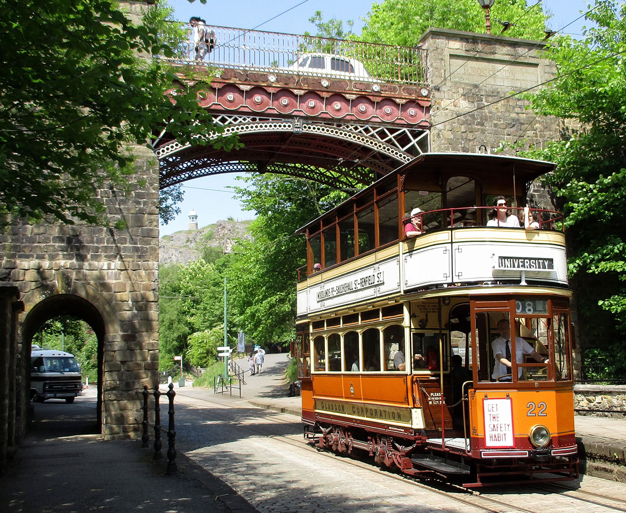 With a car on Bowes Lyon Bridge and a van seen through the pedestrian arch Glasgow 22 heads under the bridge back to the town.
