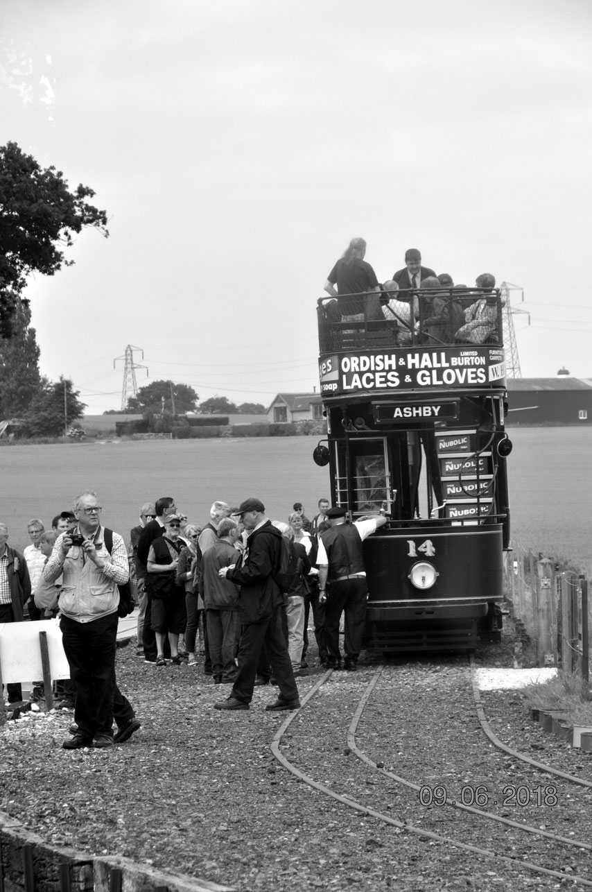 A black and white image as more passengers board the tram at the terminus for another ride at £1 in each direction.