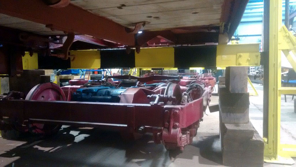 And then the first truck is placed under the tram. At this point the body remained raised on jacks.