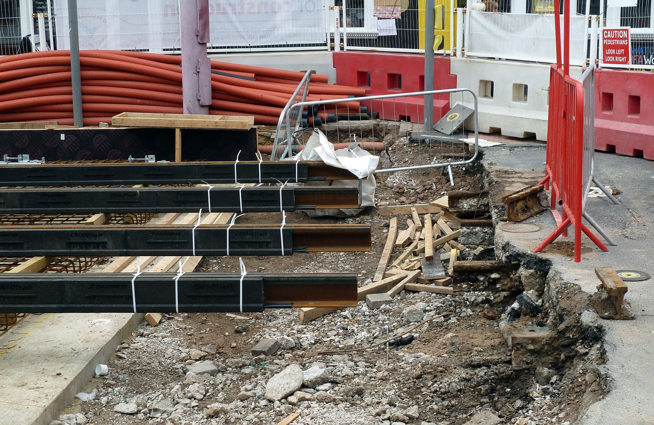 Friday 13th July was no unlucky day in Blackpool with the first rails now in place on the North Station extension. This first view shows the new track meeting the old track which is still being found underneath the old road service.