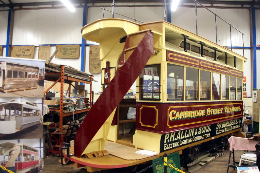 The nomadic Cambridge Street Tramways 7 was built for Bath in before being sold on for further use in Bradford and eventually arriving in Cambridge during 1894. Withdrawn 20 years later 7 was sold on for further use and was finally saved for preservation in 2003. Now under restoration excellent progress has been made recently with the paintwork now being completed. This 4” gauge tram will eventually be displayed in the main museum.