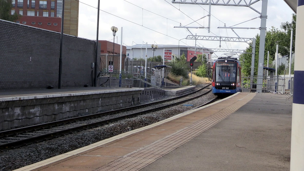 In this first view we see 399 202 heading through the railway platform at Rotherham Central with the home of Rotherham United FC in the background.
