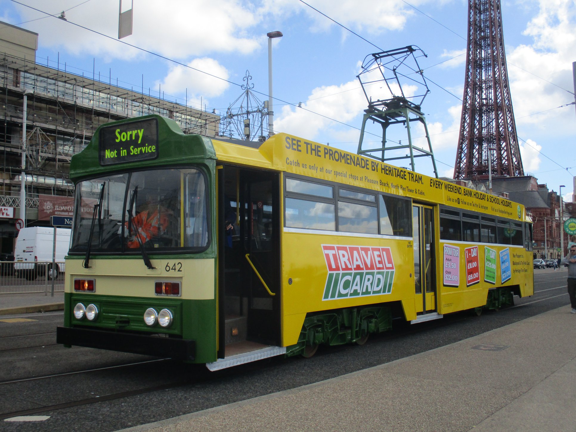 642 shows off its Travelcard advert livery, complete with the ends painted in 1990s style green and cream, whilst pausing at North Pier on its debut outing, on 10th August.