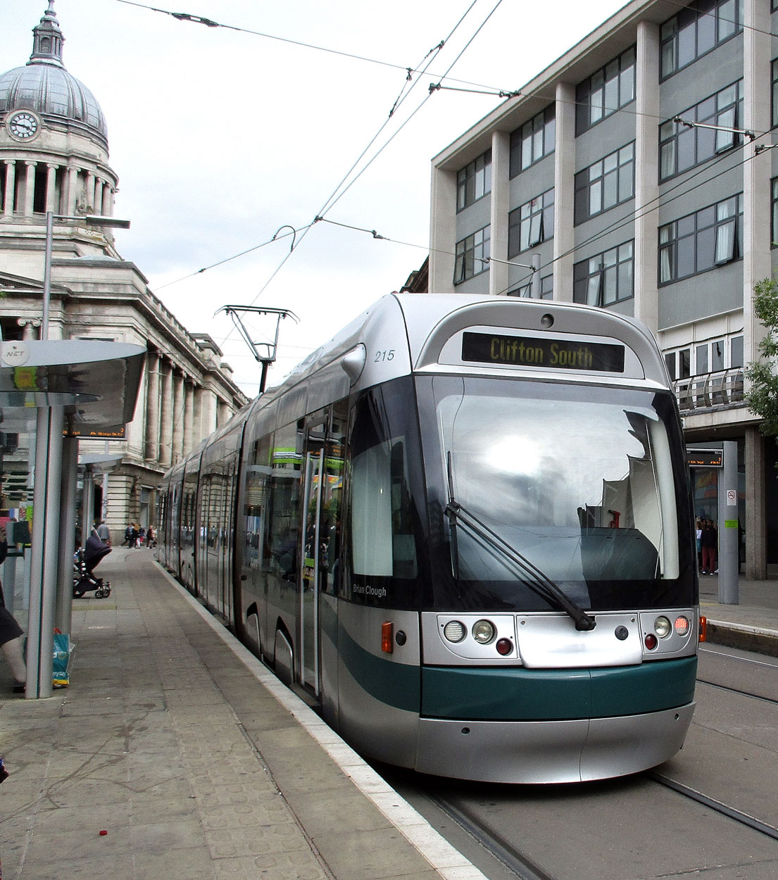 The last of the Bombardier Incentro trams, 215, sits at Old Market Square waiting to depart with a service to Clifton South.
