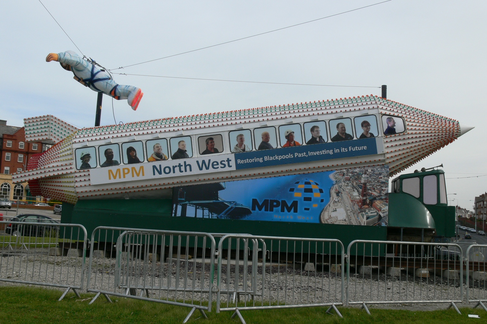 The Rocket, 732, seen on Gynn roundabout earlier this year, with the barriers then placed around it clearly visible, along with the giant spaceman suspended above it! (Photo by Andrew Waddington)