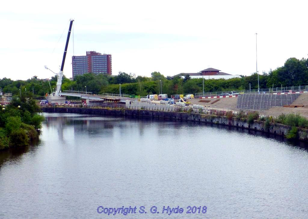 Again from Trafford Road this view shows the length of the approach ramp from Trafford Road up to Pomona stop with the crane gently lowering the bridge beam into place.