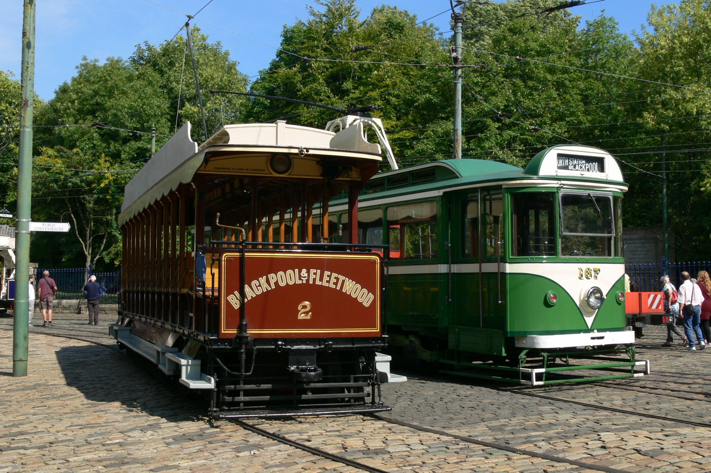 Blackpool & Fleetwood 2 and Blackpool 167 pose on the depot fan as part of the lunchtime ‘birthday trams’ photo opportunity.