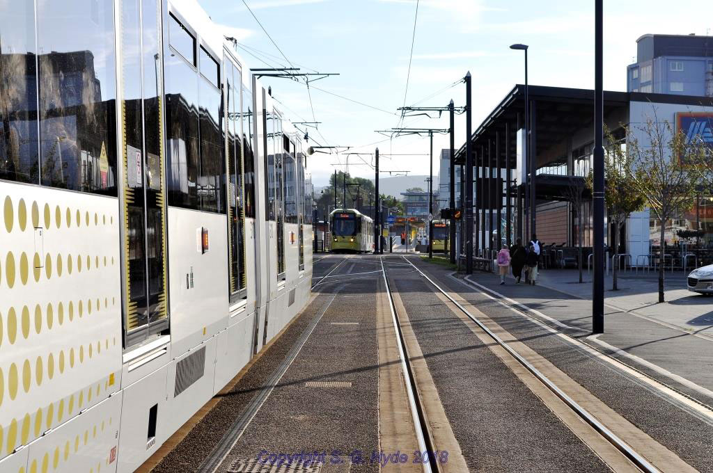 As 3061 departs Ashton for Eccles 3110 has just drawn up at the crossovers and waits to enter the platform vacated by 3061. 3073 awaits its turn to leave for MediaCityUK.