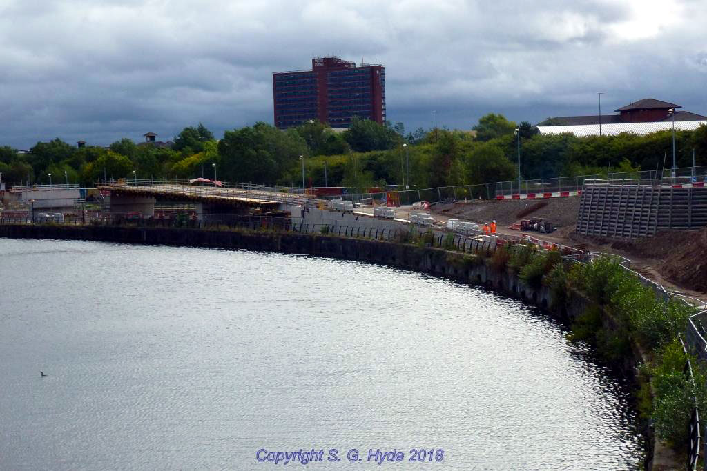 A wide view of the ramp down from Pomona Trafford wharf taken from Trafford Road showing the extent of the bridge works so far. A further road closure is booked for 29/30th of September to install the remaining sections.