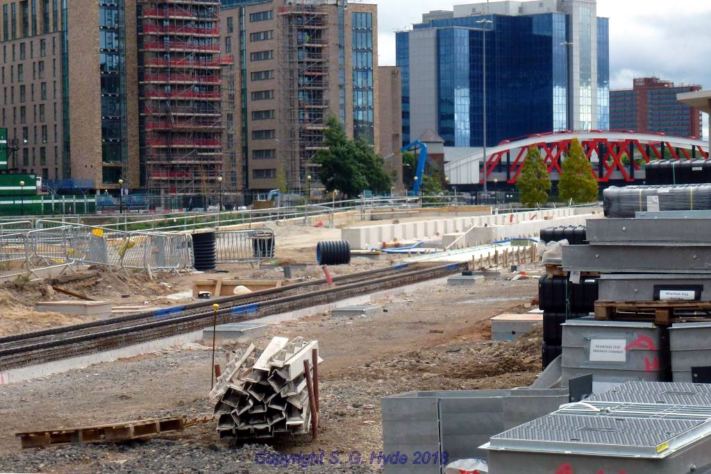 We have now moved down onto Trafford Wharf Road at Wharfside stop where tracklaying has just started and the first section of track is visible.