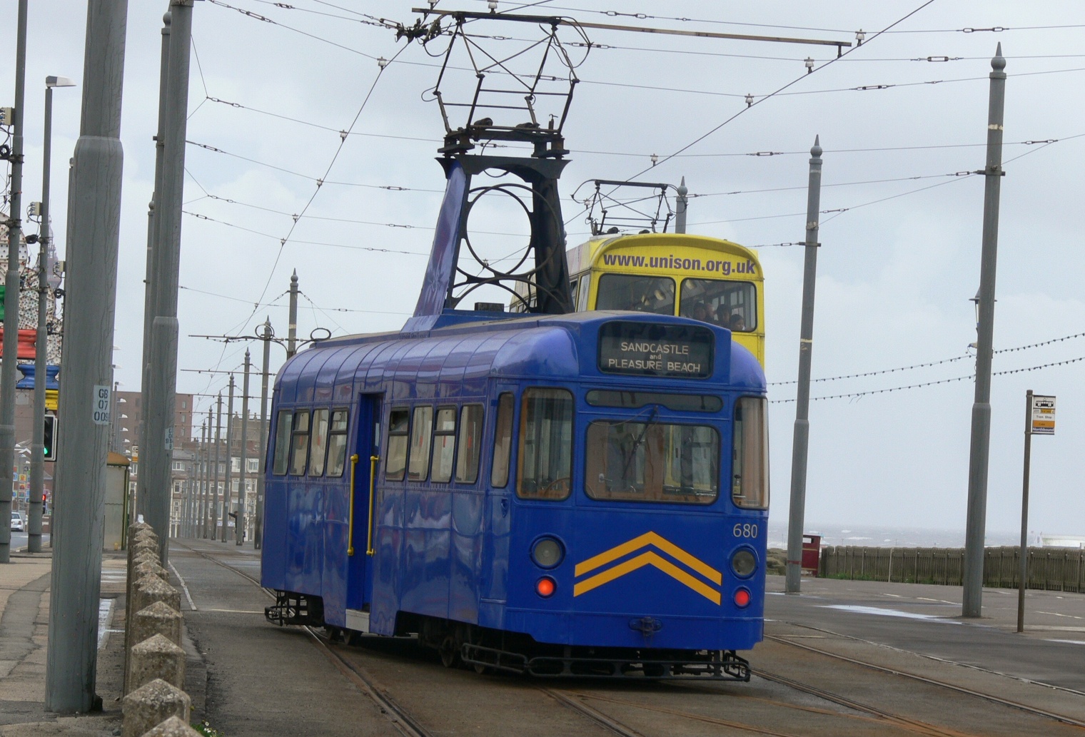 Blackpool 680 pictured reversing at Cabin during 2008; its last year of service at Blackpool. Since then the drab blue colour has been replaced by an equally plain but more stylish cream livery. (Photo by Tony Waddington)