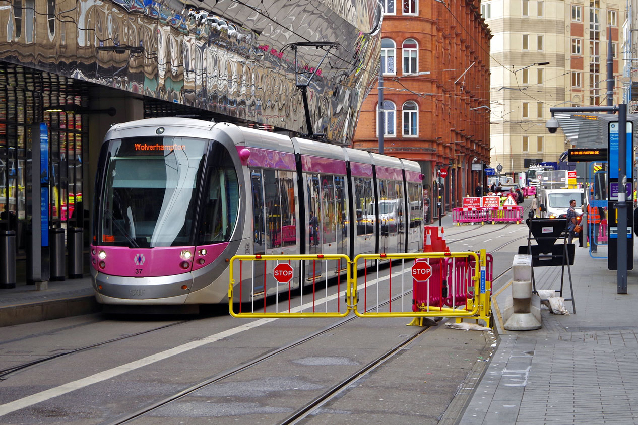 37 stands at Grand Central. Barriers block the other track, the road where the trams used to run to reverse is closed and the passenger information display tells prospective passengers to use platform 1.