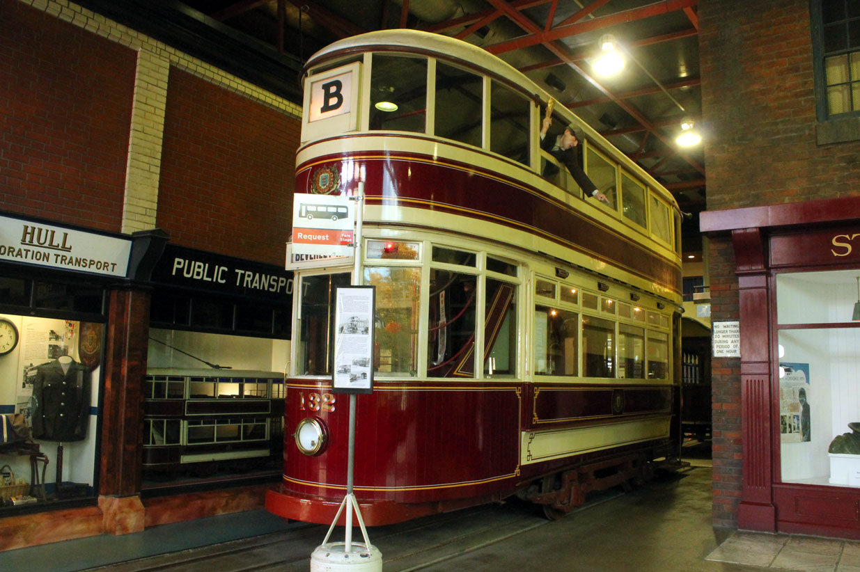 Hull 132 has been back in Hull for over 30 years on loan from the Tramway Museum Society and is one of the prime exhibits at the Streetlife Transport Museum. The loan agreement has recently been extended and 132 is set to remain in its home city for a number of years to come. With a request bus stop alongside the tram – and a model Hull tram in a display case beyond – this view shows 132 on display.