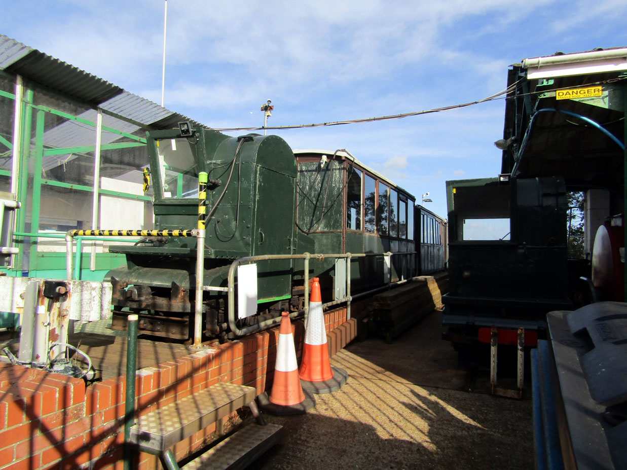 The line is operated by third rail and this first view shows the service train waiting at the land end terminus with one of the locomotives waiting for departure. The other locomotive is also seen stabled out of use on the right. Both locos are over 100 years old and were formerly battery operated before making their way to Hythe.