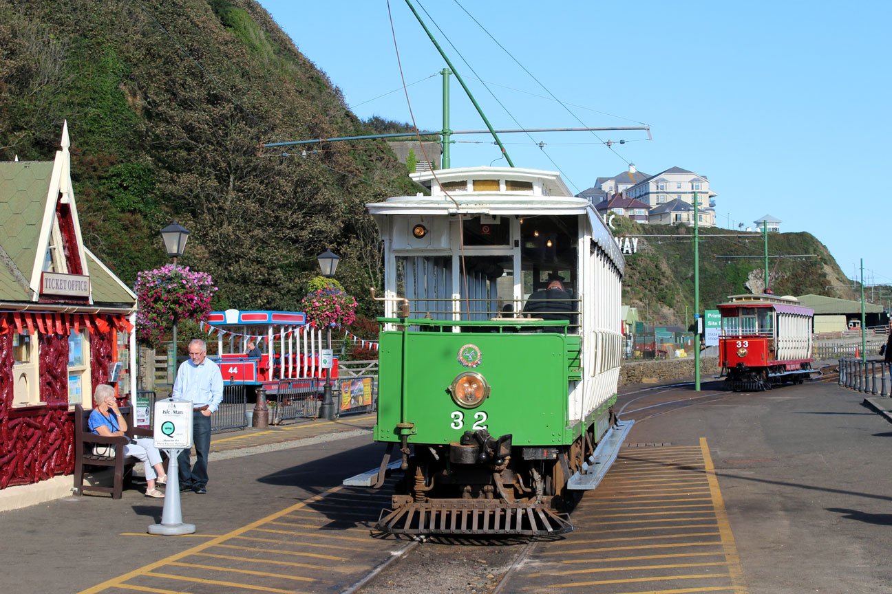 With the tram heading off north in numerical order in this view we see green liveried 32 waiting for departure at Derby Castle with 33 in the background waiting pull forward.