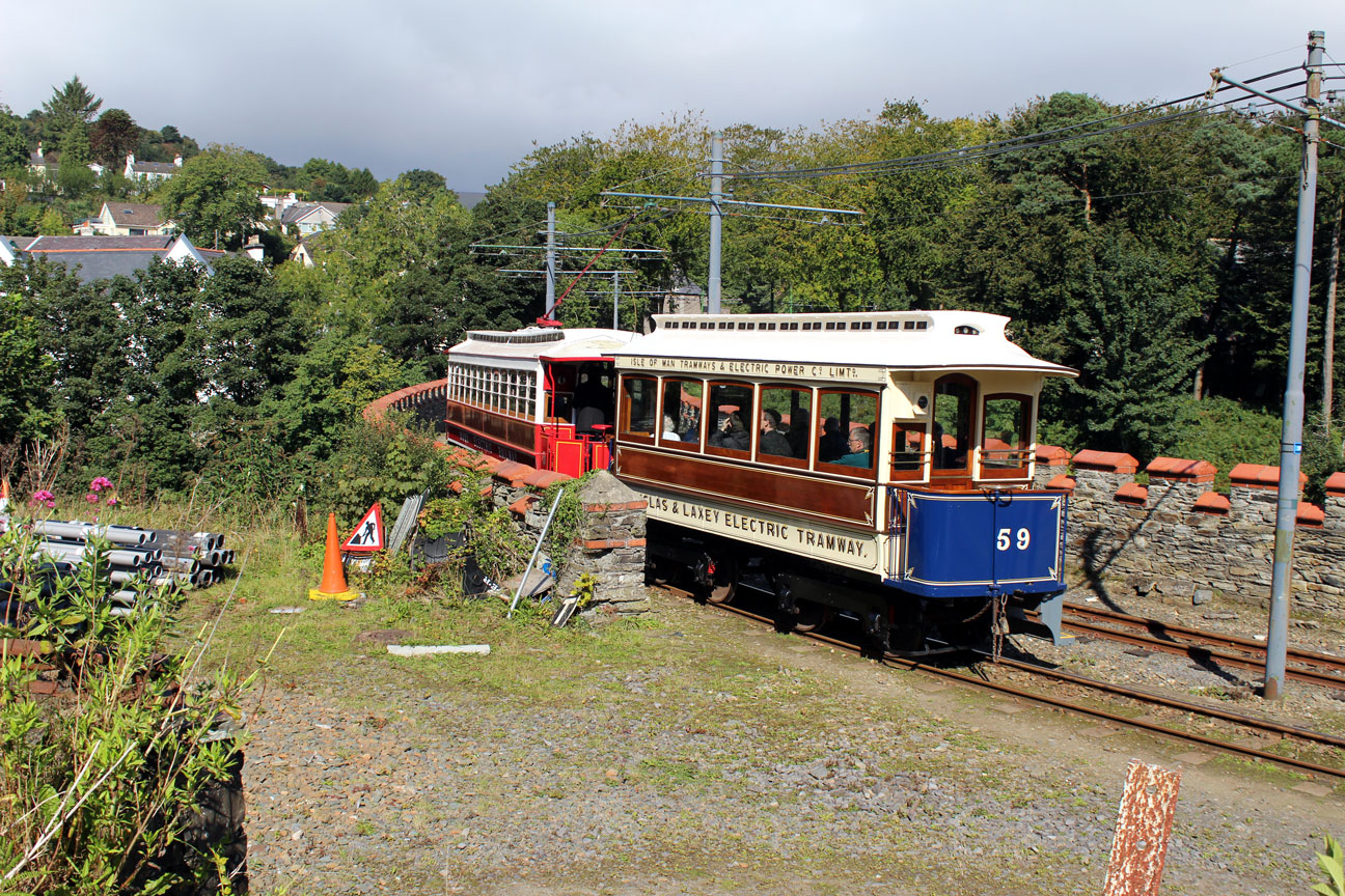 On its very first journey after overhaul and a stunning repaint into this Douglas & Laxey Electric Tramway livery we see 59 (with 2 providing the power) approaching Laxey Station on 7th September. This trailer had last run in March 2015 when it derailed but was returned to use in time for the 125th anniversary events.