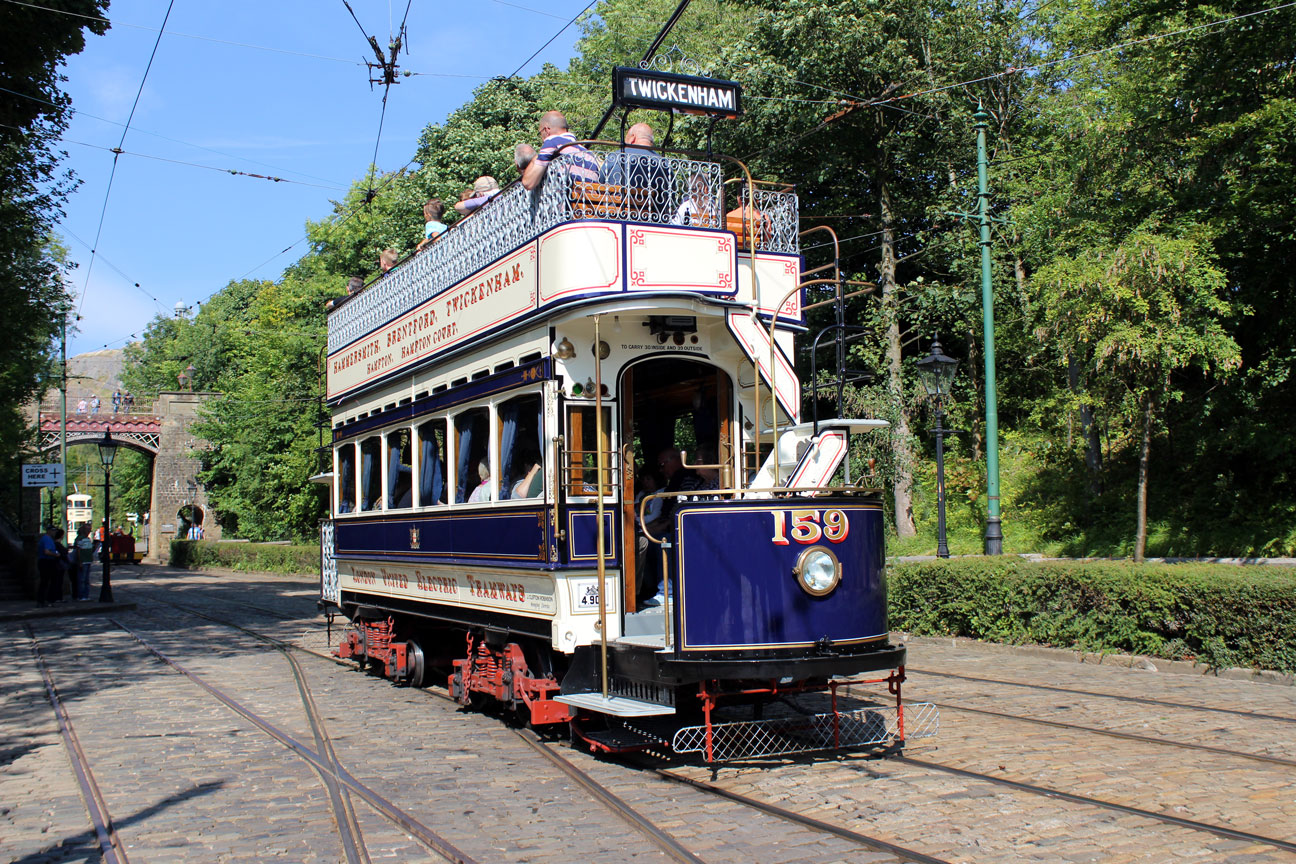 Another view outside of the depot with the tram included this time being London United Tramways 159. This time there are passengers on board – and plenty of them! – as the tram heads north to Glory Mine.