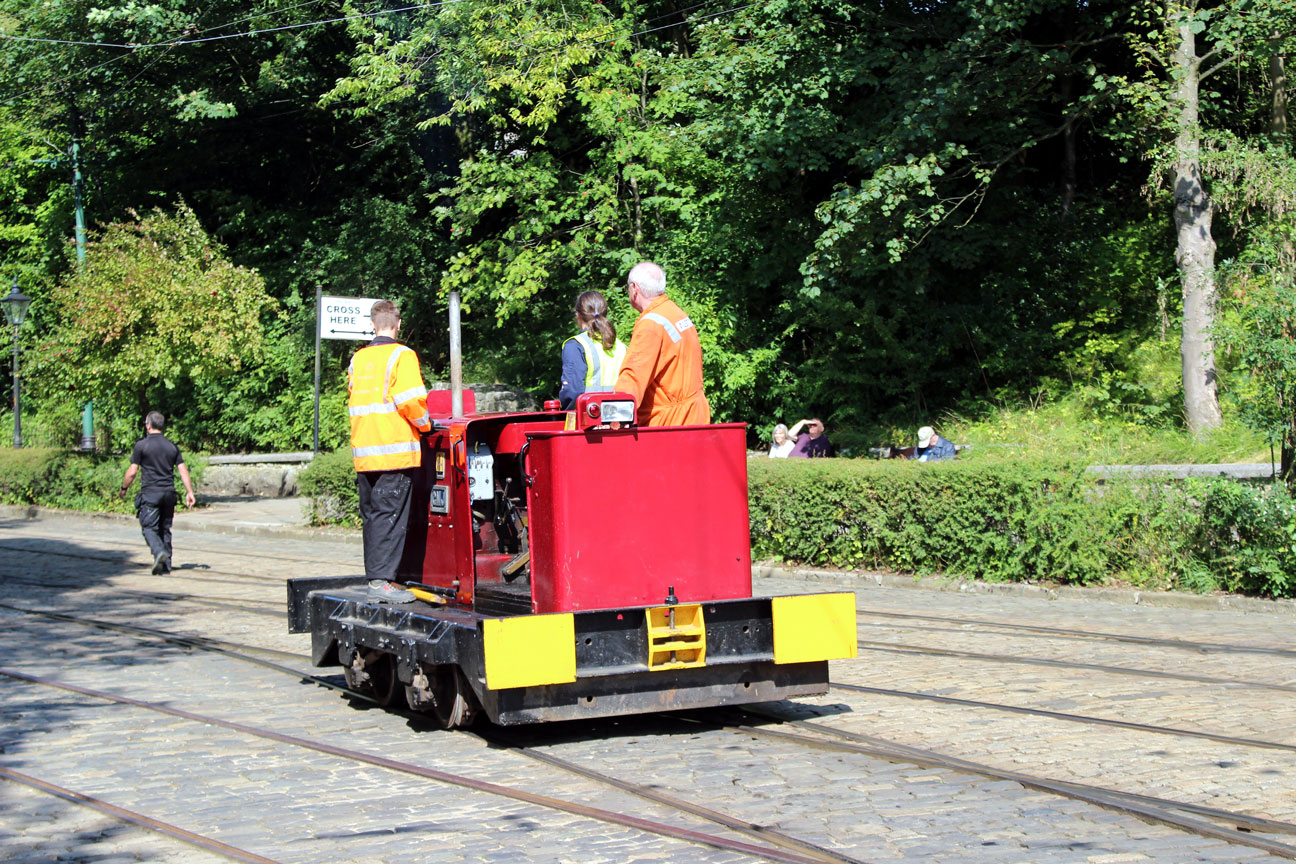 Returning to service in 2018 after workshop attention diesel locomotive GMJ heads away from the camera outside the depot. This small loco was originally used on the quarry line before a tram museum was even thought about and remains a valuable member of the works fleet to this day.