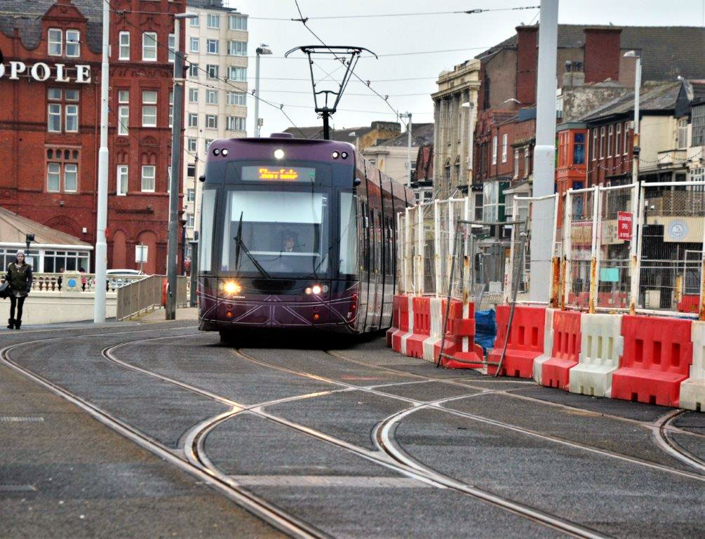A Flexity tram gently makes its way past the barriers surrounding the junction trackworks. (Both Photographs by Tony Stevenson)